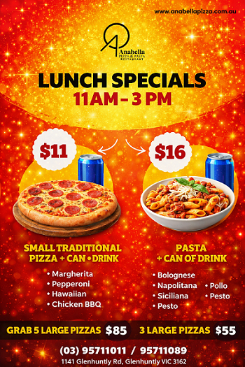 Anabella Pizza and Pasta Glen Huntley has been established for nearly 30 years serving you the best pizza, pasta, salad, and meals and we're still going better than ever.